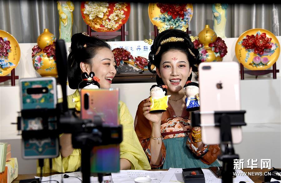 在洛阳李学武牡丹瓷园,主播通过直播的方式推荐牡丹瓷(4月26日摄)。 新华社记者 朱祥 摄