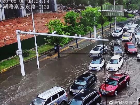 实时交通动态:5月8日8时08分,渍水路段新增1处:沙湖路秦园东路路口。建议广大市民提前规划线路,合理绕行。(@武汉交警)