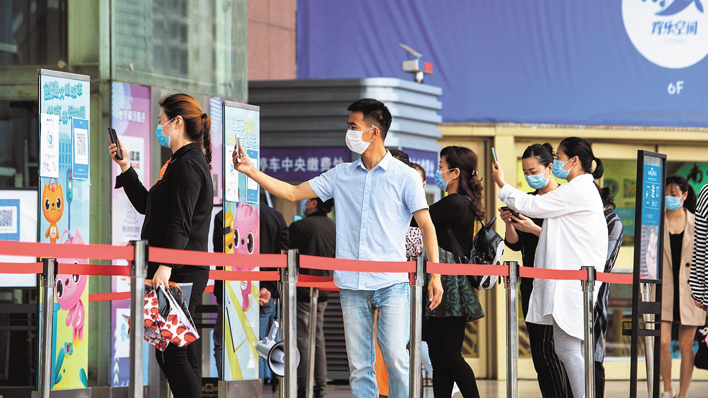 5月8日,武汉市徐东大街销品茂,排队的顾客在自觉扫描健康码进店。连日来,武汉各大商圈严格落实各项防控措施,疫情防控力度丝毫不减。