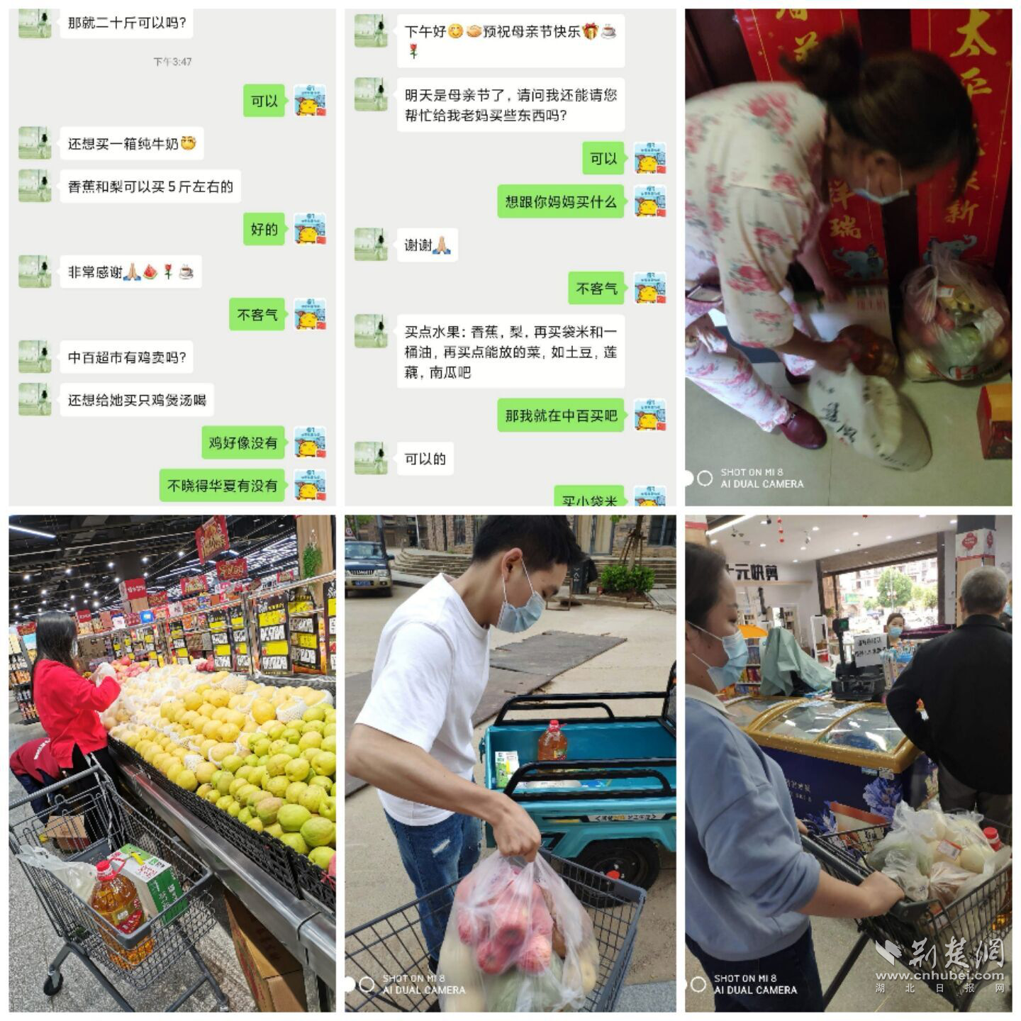 5月9日,居住在龙湖社区的邵阿姨收到了社区网格员送来的米、油、水果等。原来,她的女儿艾女士一早从广州向网格员王丽发来了一条求助短信:“明天是母亲节了,能请您帮忙给我母亲买些东西吗?”艾女士长期居住在广州,因母亲邵阿姨不适应那边的气候,一个人住在武汉军山街龙湖社区。“母亲一辈子节约惯了,父亲也去世了,她一个人住我还是挺不放心的。”作为女儿的她想趁着节日来表达对母亲的爱。