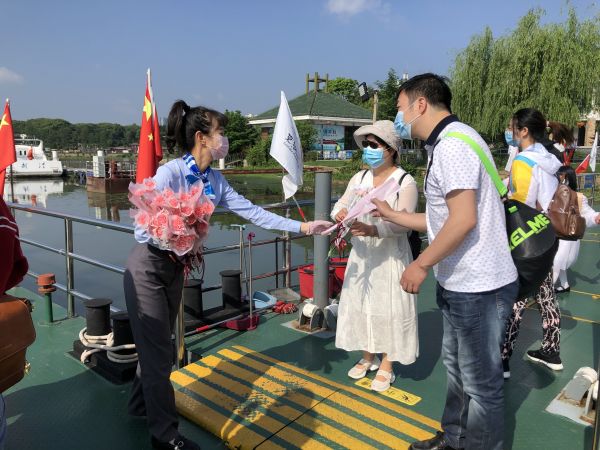 长江网5月10日讯(见习记者李文婕 通讯员高梦雅)“妈妈,花好漂亮,我们能带上船吗?”5月10日,武汉科技大学附属天佑医院的医护人员受邀来到楚风园码头,东湖游船特别安排了金牌讲解员“蓝丝巾”,为医护人员送上象征着祝福的粉色康乃馨。
