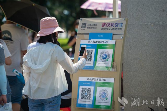 5月10日,武汉东湖听涛景区,游客扫码离开景区。