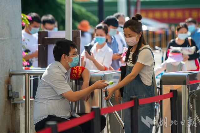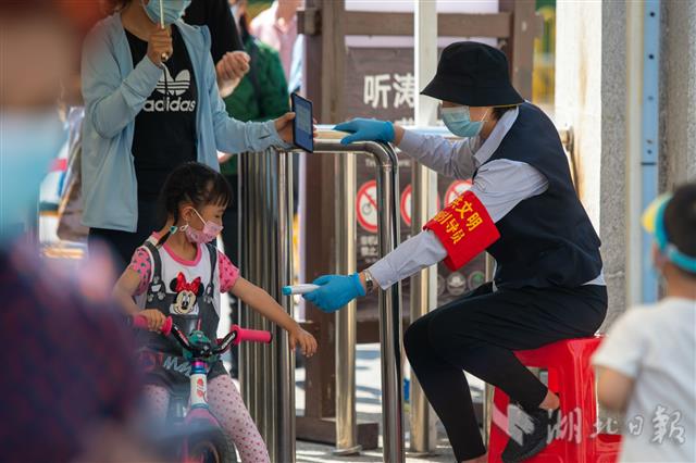 5月10日,武汉东湖听涛景区,工作人员为游客测量体温。当日正值周末,客流量明显增加,工作人员在景区门口张贴多个二维码让市民分流尽快入园,同时严格执行引导游客进出扫码、测量体温等防控工作。(湖北日报全媒记者 蔡俊 摄)