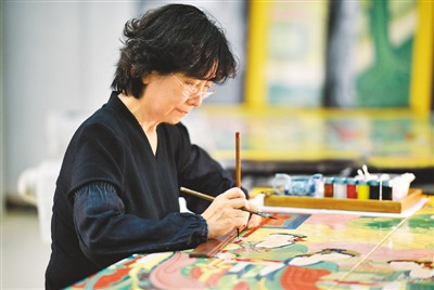 图为工艺美术大师胡昕在进行屏风画面最后的检视修补。
