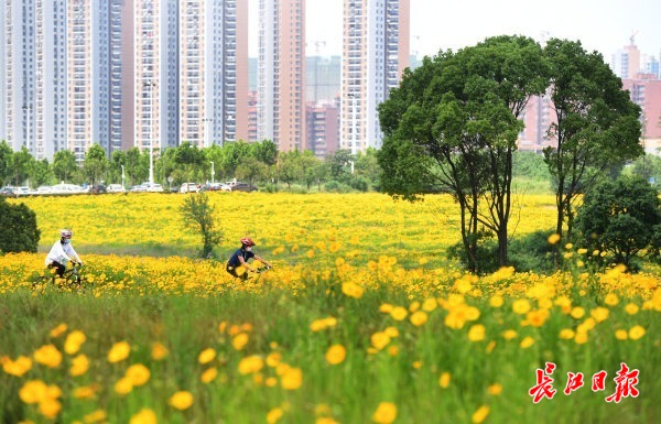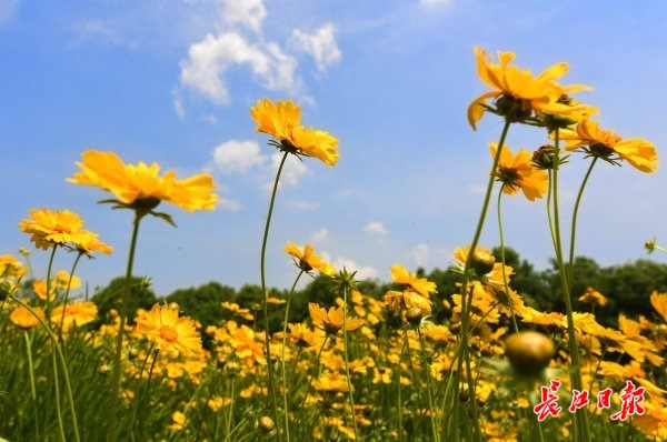 长江网5月11日讯 11日,东湖高新区政务中心九峰一路沿线,金黄色的大花金鸡菊在微风中摇曳,形成一条长达一公里,面积约11万平方米的花海,大花金鸡菊每年5月至9月盛开,由于耐旱易生长,适合作为公共观赏性花卉种植。(记者高勇 通讯员吴非 王万里 摄影报道)