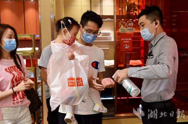 图为店员为顾客消毒。