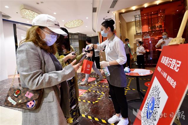 图为店员为顾客测量体温。