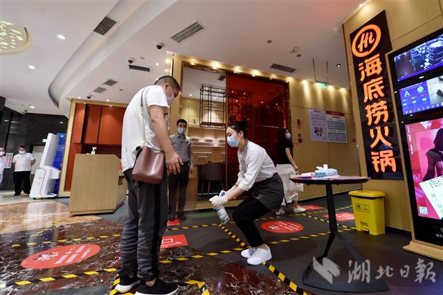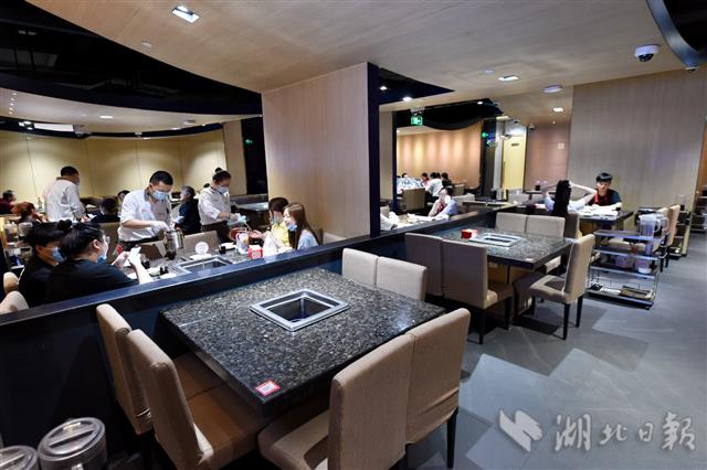 2020年5月11日,海底捞火锅武汉群星城店恢复堂食,顾客经扫健康码、测量体温、全身消毒后进店就餐。该店严格执行防控措施,只开放50%餐位接待顾客,餐位安排保障1米间距且每桌人数不超额定人数。暂停后厨参观以及与顾客直接接触的服务(美甲、擦鞋、游乐园)。当日,武汉市首批共7家海底捞门店恢复堂食。图为餐厅内,邻桌一律不接待顾客,以保障间距。(湖北日报全媒记者 李溪 通讯员 彭蓓蕾 杨影影 摄)
