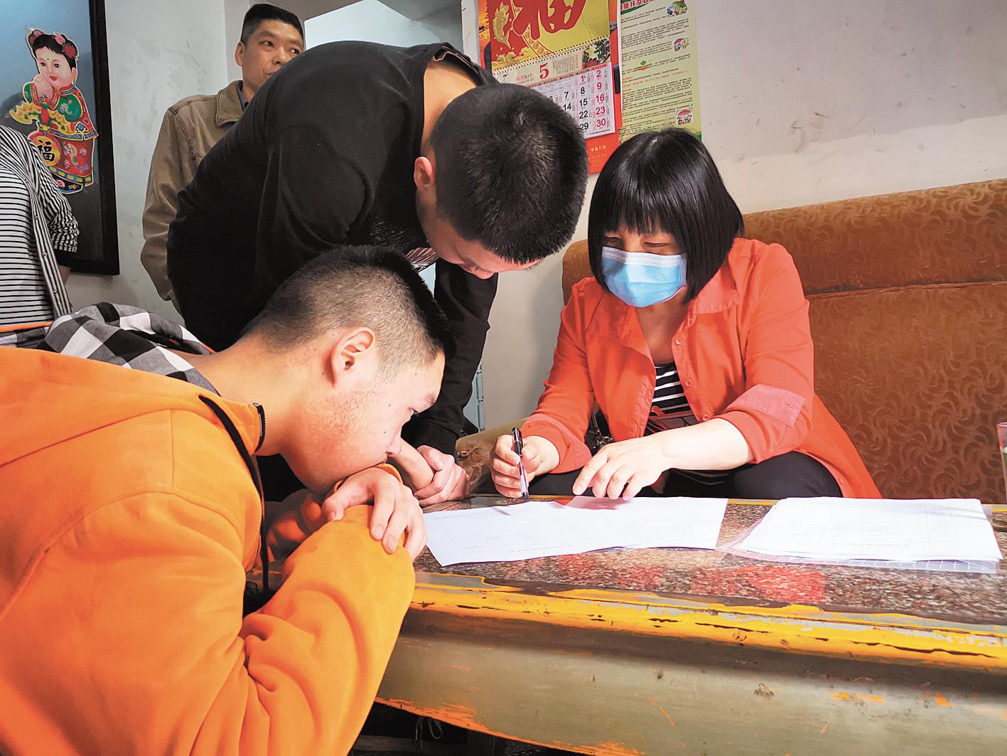 刘发英(右)指导李家两兄弟填表。