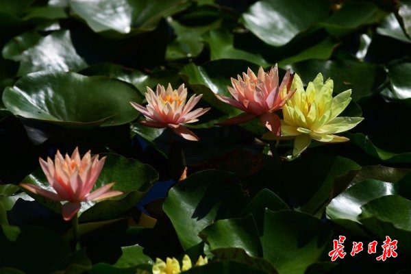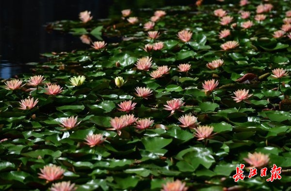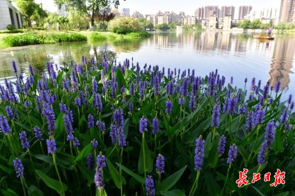 长江网5月13日讯 5月12日,在内沙湖公园湖面上,成片的深绿色莲叶铺满水面,一支支淡粉或淡黄色的花朵亭亭玉立,挤挤挨挨地点缀在莲叶间,不时有路过的市民在水边栈道驻足拍照。湖岸边,蓝色的梭鱼草、洋红色的千屈菜、紫色的再力花、棕褐色的水葱花也纷纷开放。长江网记者发现,睡莲开花比去年提前了约一个月,其他水生植物的花期也有所提前。(记者李永刚 摄影报道)