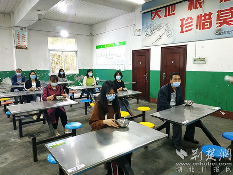 图为:老师们模拟食堂错开就餐。通讯员 供图