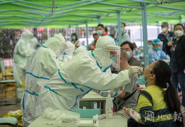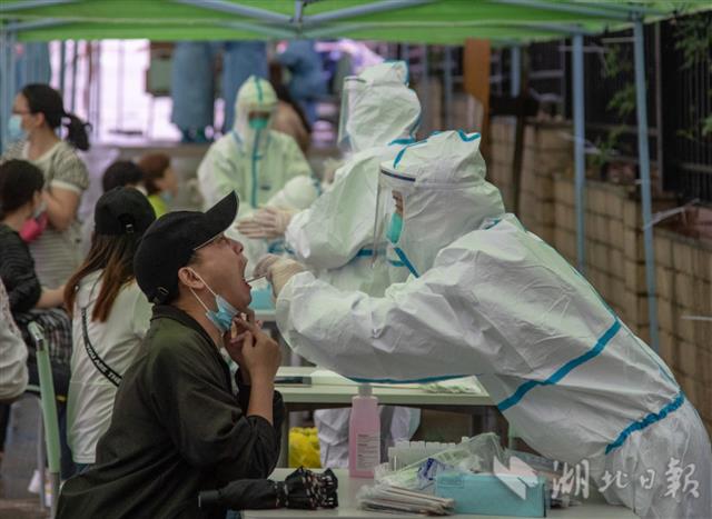 5月14日,武汉大学中南医院的检测人员上门服务,为中国电信武汉分公司返岗的3000多名员工进行新冠病毒核酸检测。目前,武汉各区均有序开展辖区全员核酸筛查计划安排,部分重点社区已优先启动筛查。(湖北日报全媒记者 魏铼 通讯员 李晗 摄)