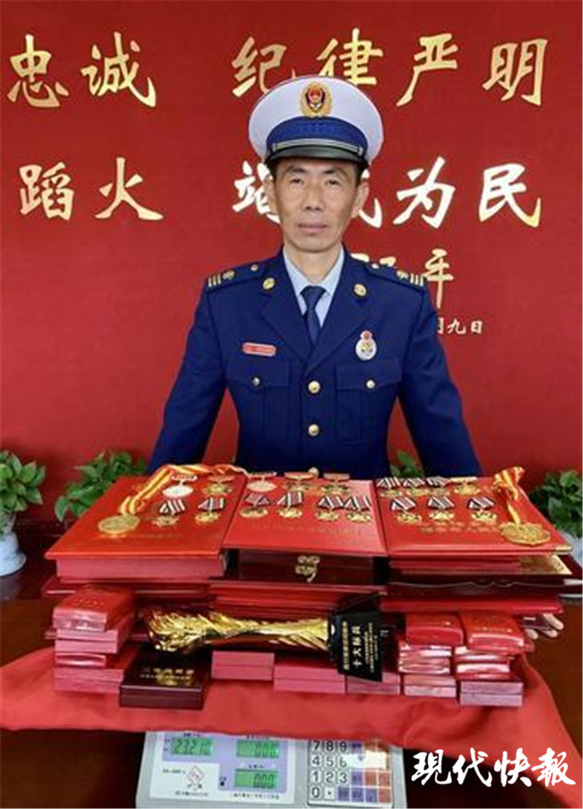 陈新宽,河南信阳人,1997年,他开始了消防生涯。2008年“5.12”汶川地震、2018年山东寿光抗洪抢险、连云港爆炸事件、响水爆炸事件……都有他冲锋的身影。工作近23年,他参加了万余次灭火救援战斗,从普通一员干到“兵王”,一身金灿灿的军功章和获得的证书足足有46斤。(来源:现代快报)