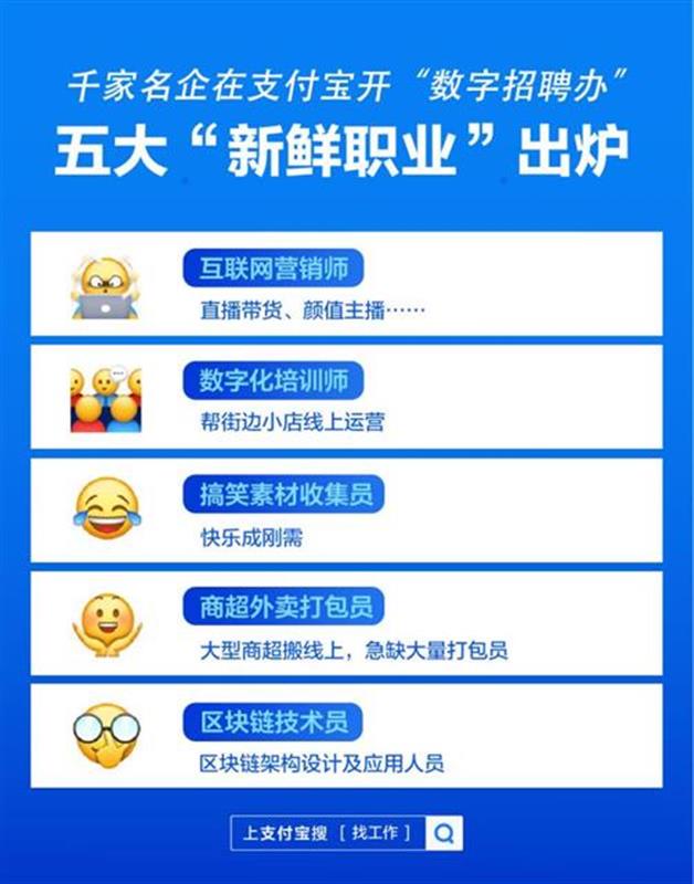 针对应届毕业生,教育部还联合支付宝校园生活团队,邀请多家企业开放海量校招职位,缓解高校毕业生就业压力。此外,一批疫情下服务业数字化转型催生出新职业也值得关注。5月11日,中国就业培训技术指导中心受人社部委托,对10个拟纳入新职业的工作信息进行公示。而支付宝上“数字招聘办”里也涌现出一批互联网营销师、数字化培训师、搞笑素材收集员等“新鲜”职业,为促进就业创业打开新思路,也为当下年轻人就业提供了更多选择。