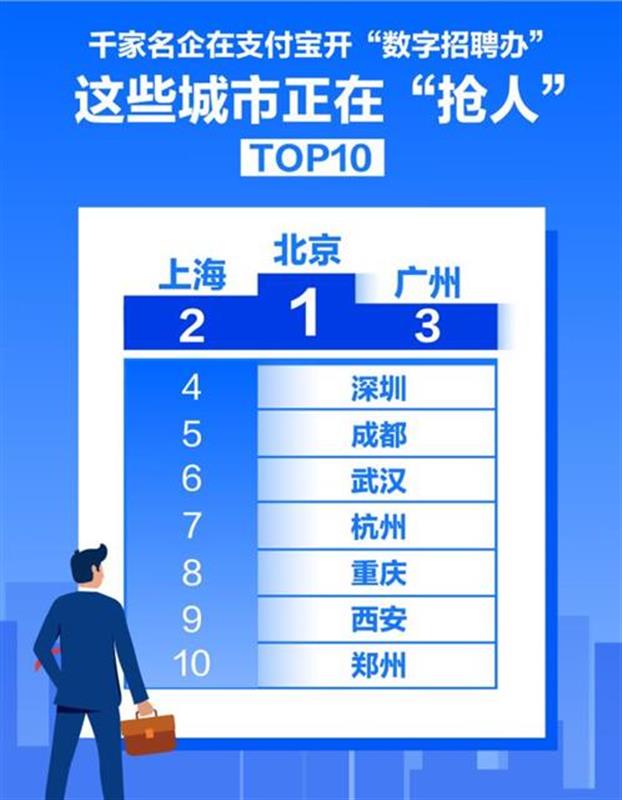 在支付宝开设“数字招聘办”的企业既有麦当劳、肯德基、必胜客、沃尔玛、强生、微软等外企,也有三只松鼠、江南布衣等国内知名企业。北京、上海、广州、深圳、成都、武汉、杭州、重庆、西安和郑州成为招聘需求量最多的十大城市,就业供给侧升温迹象明显,城市经济活力正在复苏。