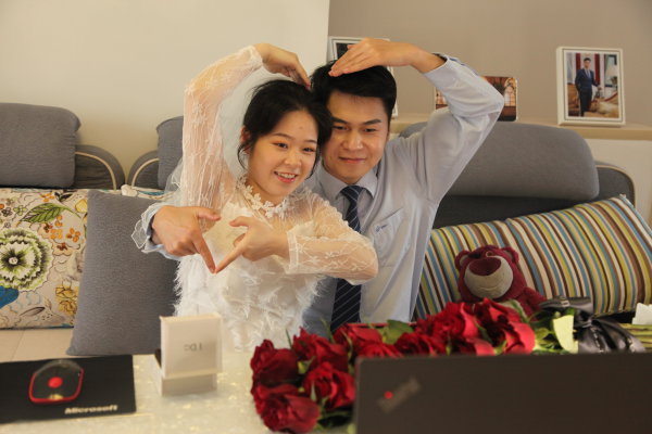 在“云婚礼”的“花式秀恩爱”环节,朱栋、周佩以这样的方式来表达“疫情不断爱情”的信念