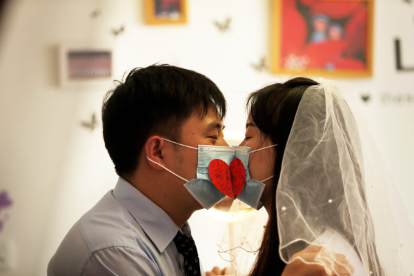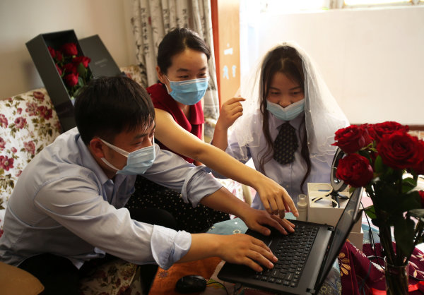 长江网5月17日讯5月17日12时48分,武汉公交一公司Y308路线管员朱栋和232路调度员新娘周佩,武汉公交六公司725路、线管员姜梦龙和新娘童淑盈,分别在自己的新房里参加了“疫往情深 共同见证——百对战疫新人云集体婚礼”的直播。这场“云婚礼”由全国百对参加过战疫的新人通过直播的方式同步参与。在网友的见证下,200位新人迎来了人生最幸福的时刻。