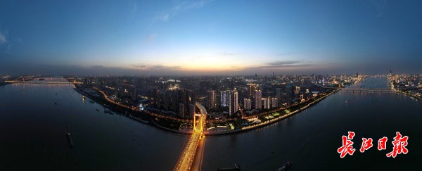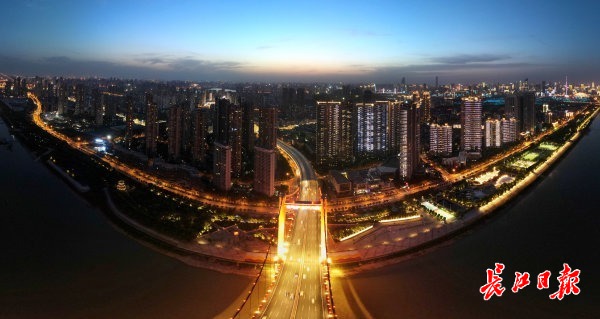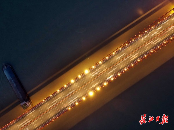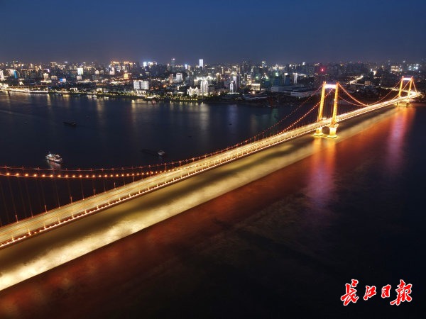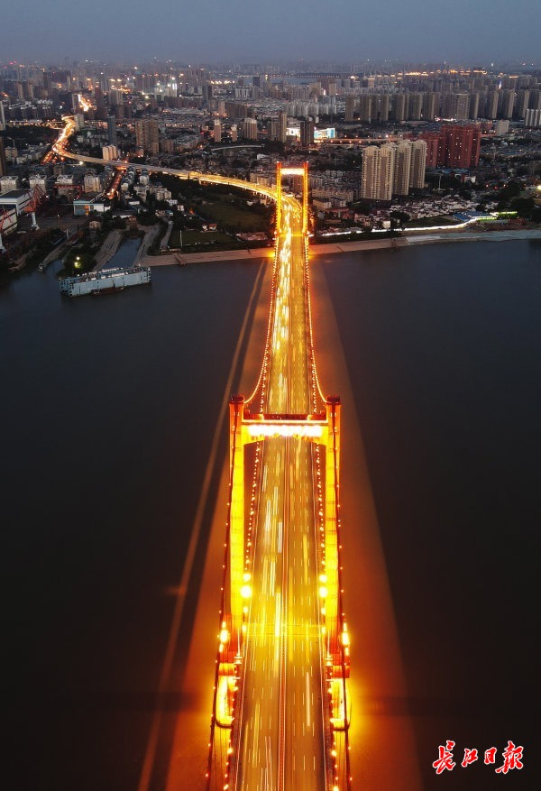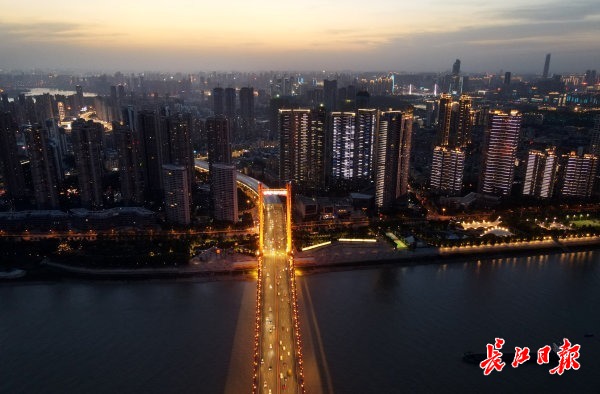 长江网5月19日讯 5月18日晚,夜幕降临,鹦鹉洲长江大桥上灯光逐渐亮起,远远望去,犹如一条长龙横卧在大江之中。记者李子云摄影报道