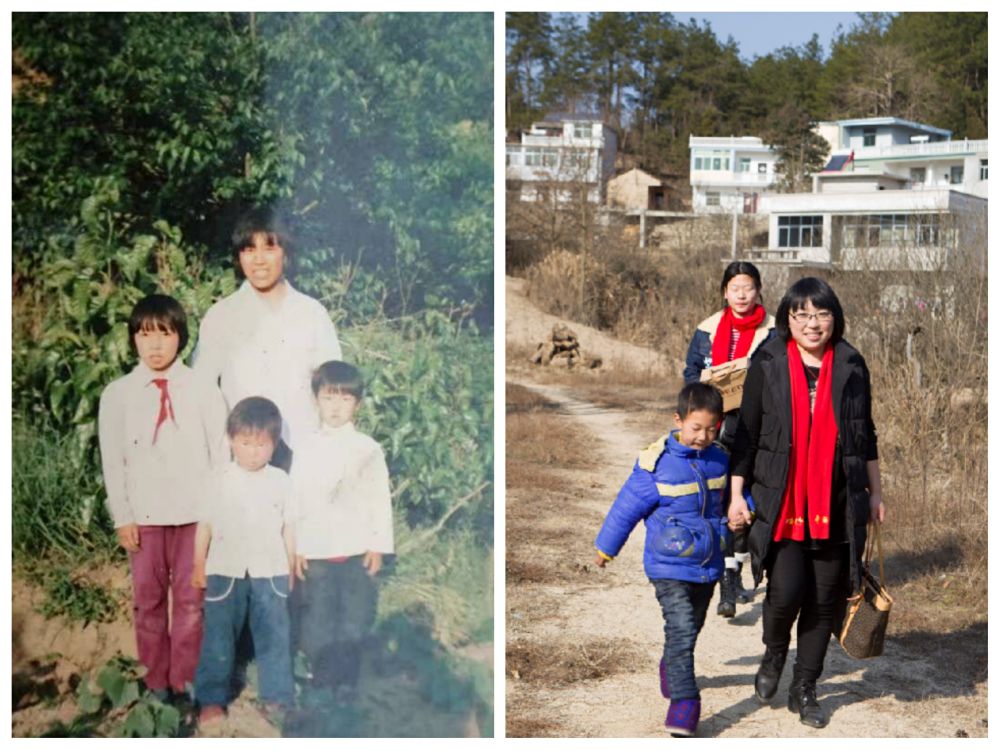 拼版照片左图:10岁的周玉梅(左一)与家人在金寨县花石乡竺山村合影。(翻拍照片,受访者提供)右图:2017年1月,周玉梅(前排右一)在金寨县吴家店镇为贫困学生送助学金和新年礼物(受访者提供)。