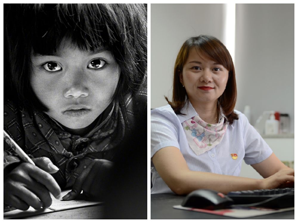 拼版照片左图:1991年4月,苏明娟在金寨县张湾小学课堂上认真听课,新华社发(解海龙摄);右图: 5月15日,苏明娟在位于安徽省合肥市的工商银行安徽分行办公室内工作(新华社记者韩晓雨摄)。