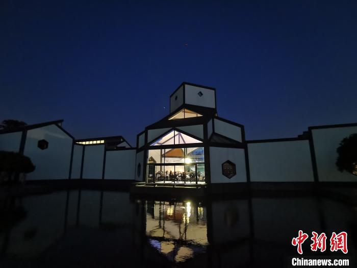 资料图:游客夜游苏州博物馆,欣赏夜色中的江南风情。 钟升 摄