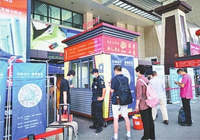 入口处一名工作人员告诉记者,除了扫码和测温外,火车站还开设了20条实名制验证通道,方便旅客快速入内,候车厅设有临时消杀区域,配齐免洗消毒液等用品,供旅客免费使用。
