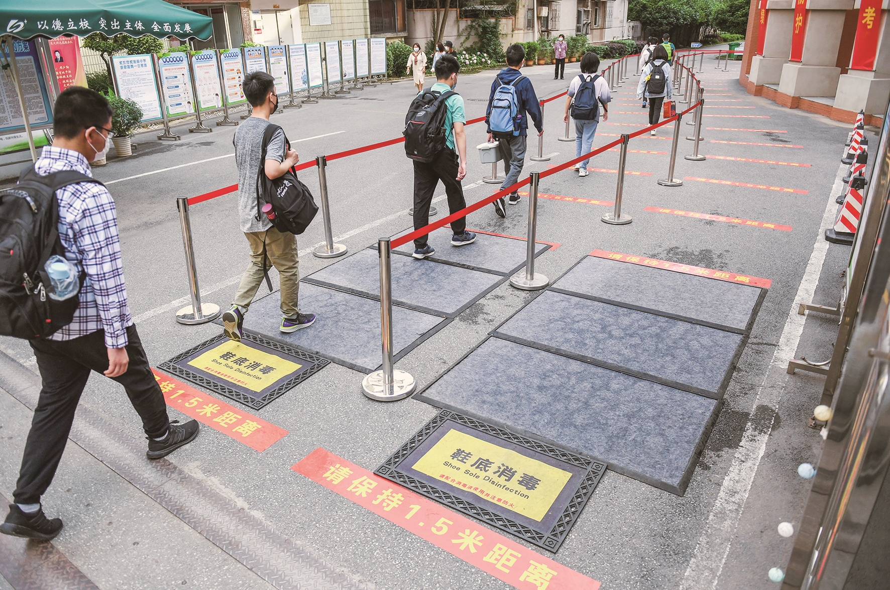 与此同时,各校普遍实行错峰入学,记者从武汉市光谷第二初级中学了解到,该校为九年级9个班设立了5个到校时段,每段10分钟供两个班学生进校。昨晨,480名初三学生均按各自的入学时段到校,在校门口按箭头指示分流进校。