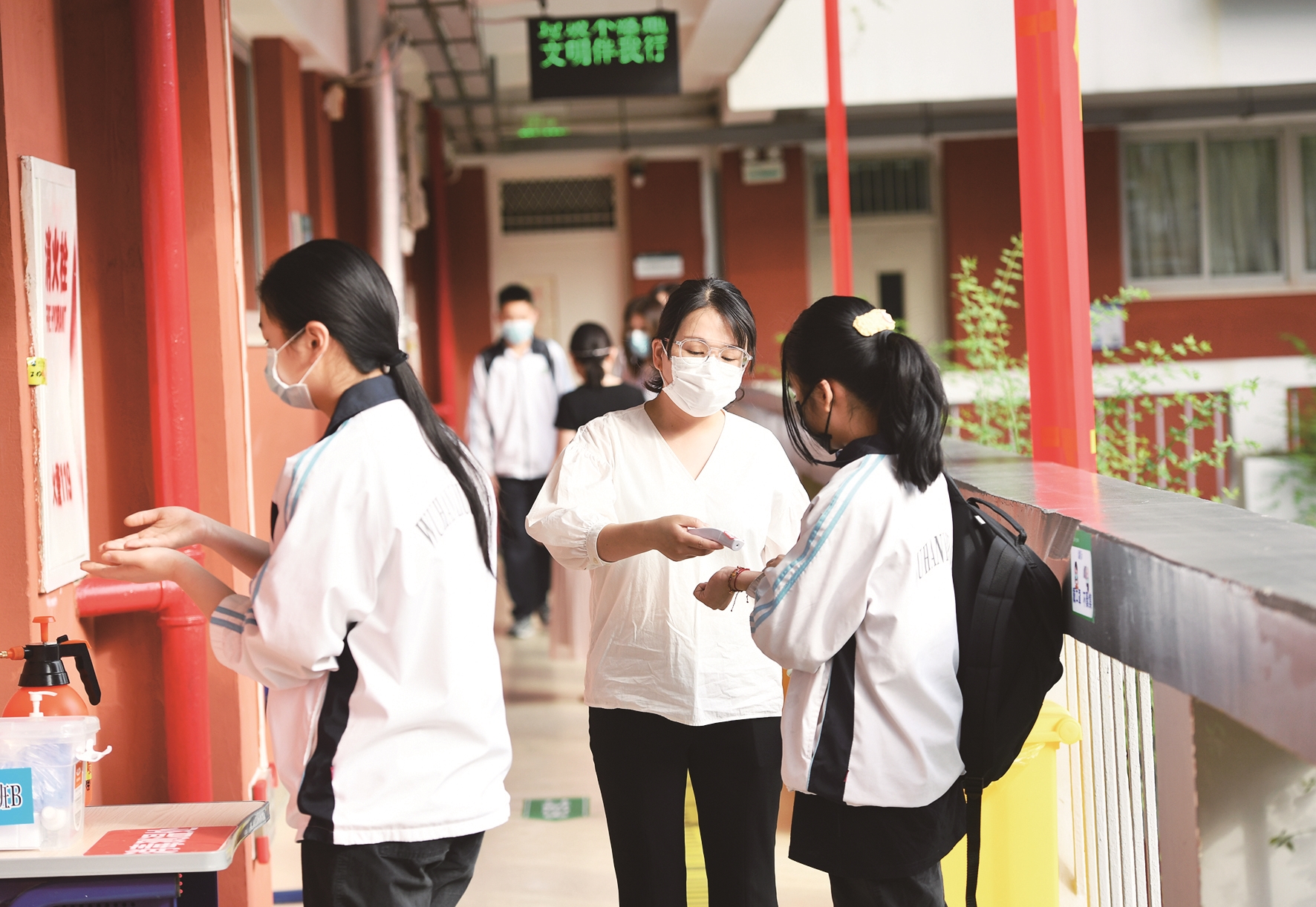 “上一次到校是5月12日做核酸检测时,14日学校就出了视频版的《复学抗疫指南》,把开学的注意事项,学习生活的流程都演示了一遍。所以我今天到校感觉很熟悉,不紧张。”昨日,武汉市江夏第一初级中学九(4)班学生符文达到校后,轻车熟路地通过测温等环节入校。