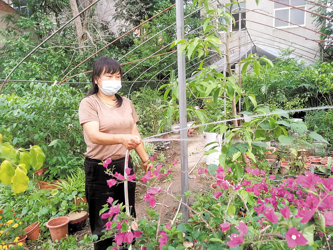 涂雪燕在打理花卉苗木种植基地。