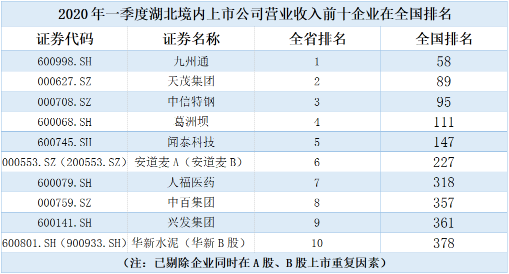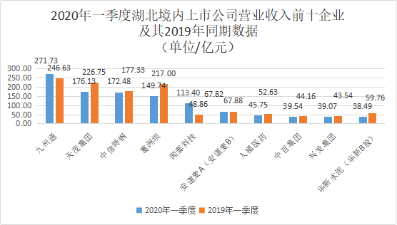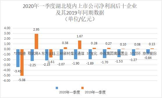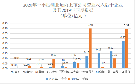有排名靠前的,就有排名靠后的。今年一季度,湖北境内上市公司营业收入排名后十位的企业,与去年一季度情况一致。