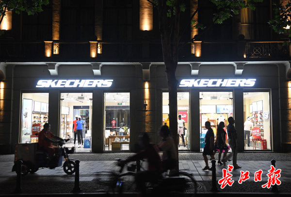 长江网5月23日讯 5月22日晚,周末的汉口中山大道沿线灯火通明,一些临街店铺在坚持消毒、扫码、测温等防疫措施的前提下,逐渐延长营业时间,方便市民避开日间高温,夜游逛街购物。(记者苗剑 摄影报道)