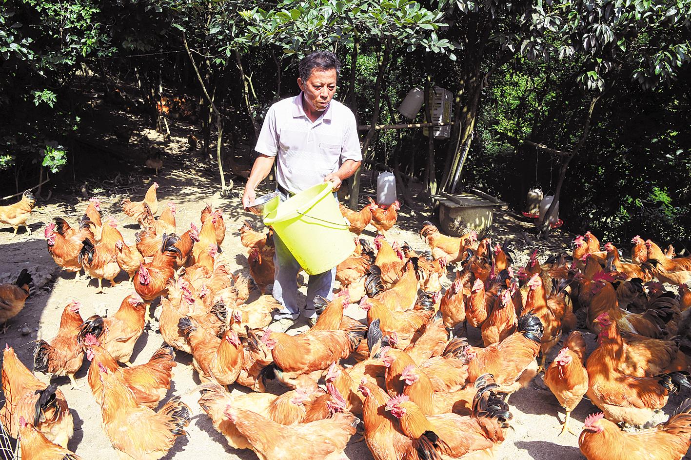 贫困户余达鑫在山上喂养土鸡。(湖北日报全媒记者 陈勇 通讯员 马丽娅 摄)
