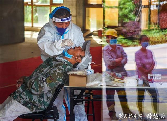 “现场氛围挺严肃的,几乎没有人喧哗。”洪山区黄家湖楚天沁园小区内,居民黄先生介绍,小区核酸检测分了两个区域,一个用于小区居民的核酸登记检测,一个用于小区内在建项目建筑工人的核酸登记检测。两个区域的受检人员都比较配合。
