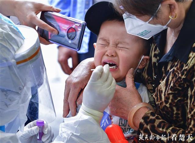 洪山区南湖北路保利蓝海郡小区,一位在奶奶怀中接受检测的男童哭了起来,留下两滴豆大的泪珠,家长和检测人员赶紧上前安抚。