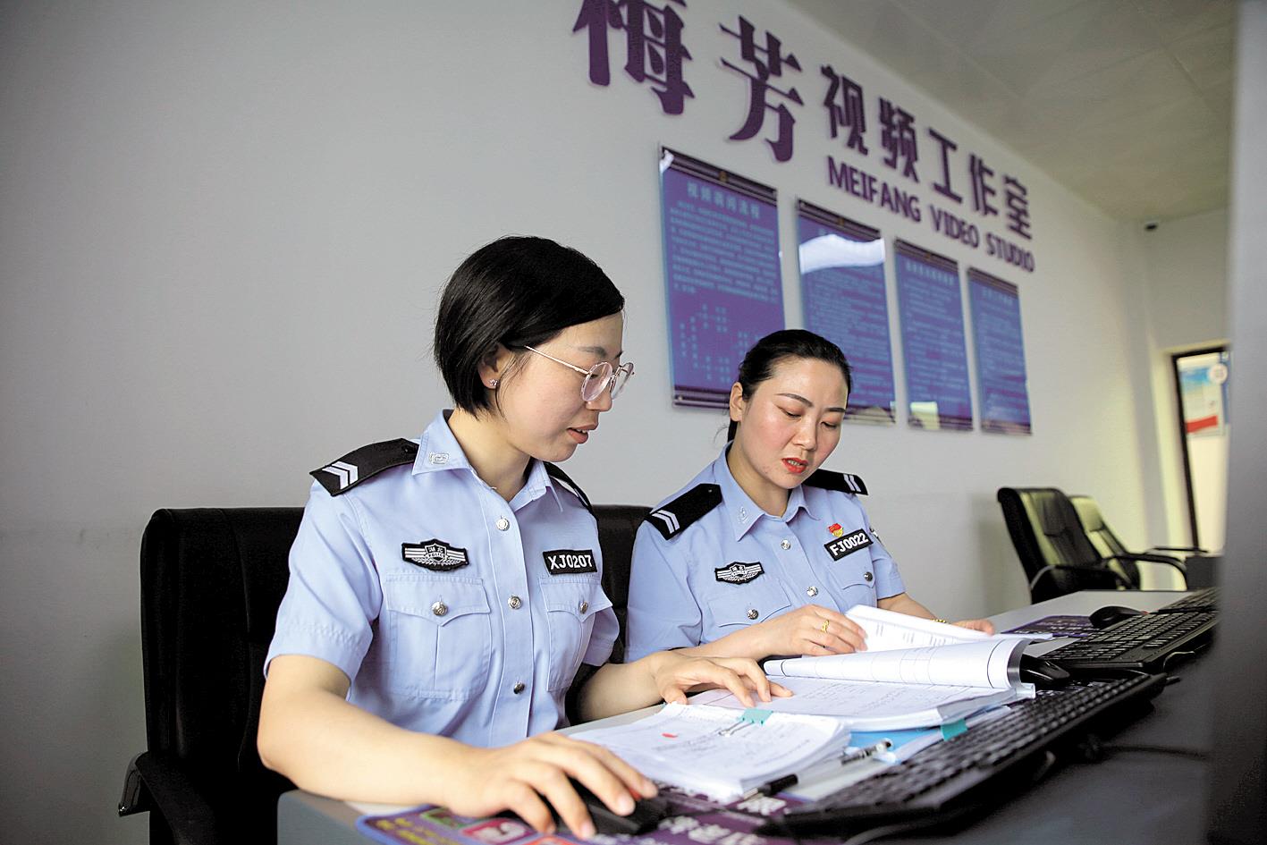 郧西县城关镇派出所“梅芳视频工作室”,董春梅(右)和陈芳在研判案情。 (视界网 杨洪霞 摄)
