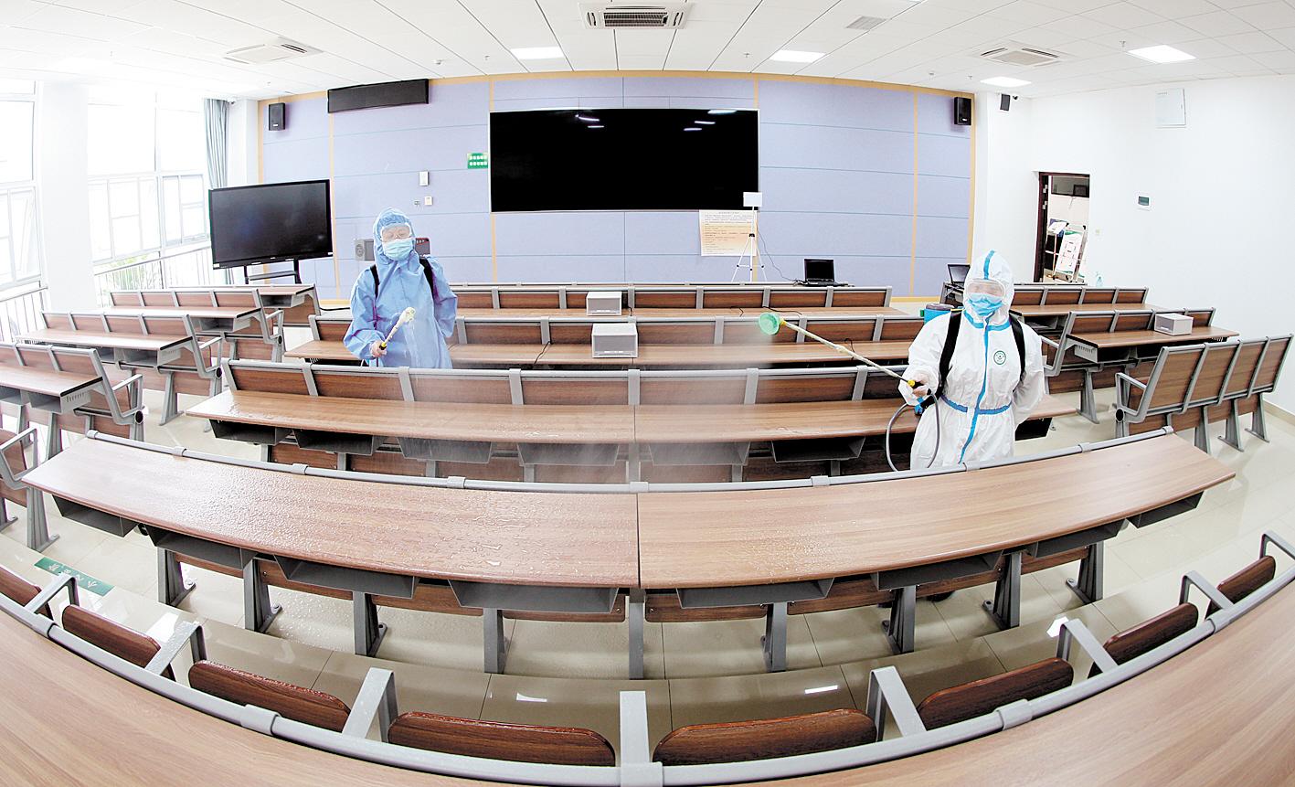 5月27日,中国地质大学(武汉)后勤工作人员在对学生教室进行消毒杀菌。当日,该校后勤工作人员对全校5000多间学生宿舍、240多间教室和教学楼间区域进行全面消毒杀菌,以迎接毕业年级学生安全返校复课。