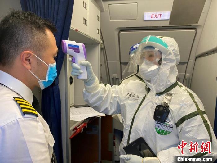 图为兰州中川机场海关工作人员对机组人员开展体温筛查。 杨冰玉 摄