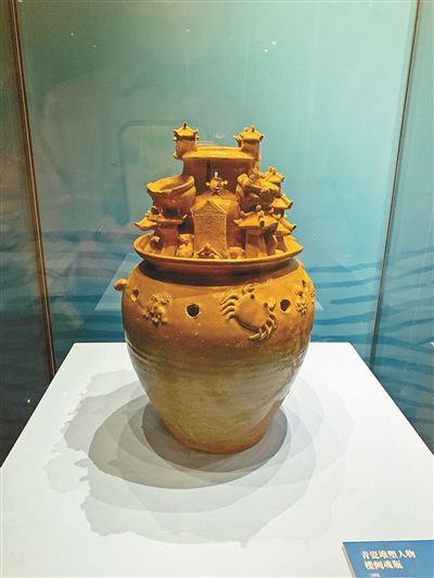首先是越窑青瓷。东汉晚期,以越窑为代表的南方青瓷烧制成功,代表了中国成熟瓷器的出现,是中国陶瓷技术的一大飞跃。孙吴治下,正是越窑青瓷生产的快速发展时期,从展览中所见的诸多精品,可知其已初具“素肌玉骨”之象,釉面均匀光亮,色泽温润。用于丧葬的青瓷魂瓶,上部装饰内容异常丰富,更反映了当时南方地区的生活情境。