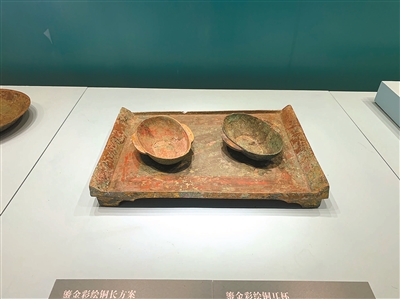 其次是朱然墓出土漆器。朱然应当是蜀汉粉丝比较讨厌的人物之一,因为他曾与潘璋一起擒杀关羽,又随陆逊击溃刘备,为孙吴名将。但朱然墓却是极其重要的考古发现。其位于安徽省马鞍山市雨山区,墓中出土了大量漆木器。漆木器是汉晋时期极具代表性的手工业产品,其在经济史、文化史、工艺美术史等方面意义非凡。但作为有机质文物,若非南方多水的特殊埋藏条件,漆木器在两千年的氧化作用下几乎不可能被保存下来。因此,朱然墓出土的这批漆器极为难得。而展览中选用的这件童子对棍漆盘又尤为特殊。其底部有“蜀郡作牢”四字,表明其产地并非孙吴辖地,而是蜀汉。在战场上,蜀吴针锋相对;在商场上,两地互通有无。如此文物见于朱然墓中,尤显耐人寻味。