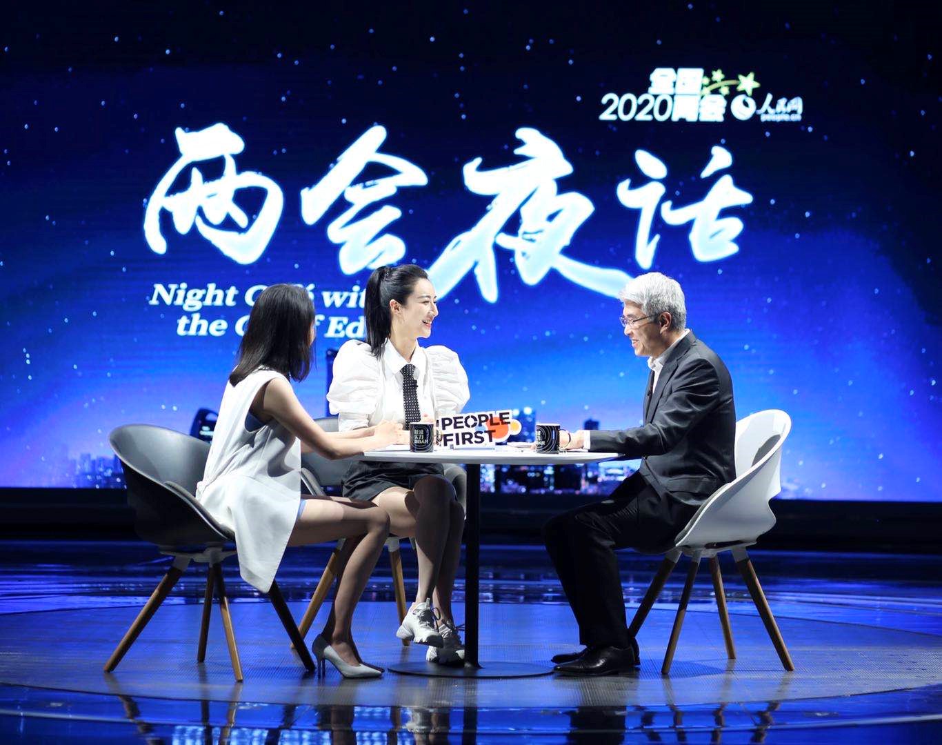 (人民网《两会夜话》对话栏目现场。右一为栏目主理人、人民网总编辑罗华,左一为栏目助播、人民网青年编辑孙竞)