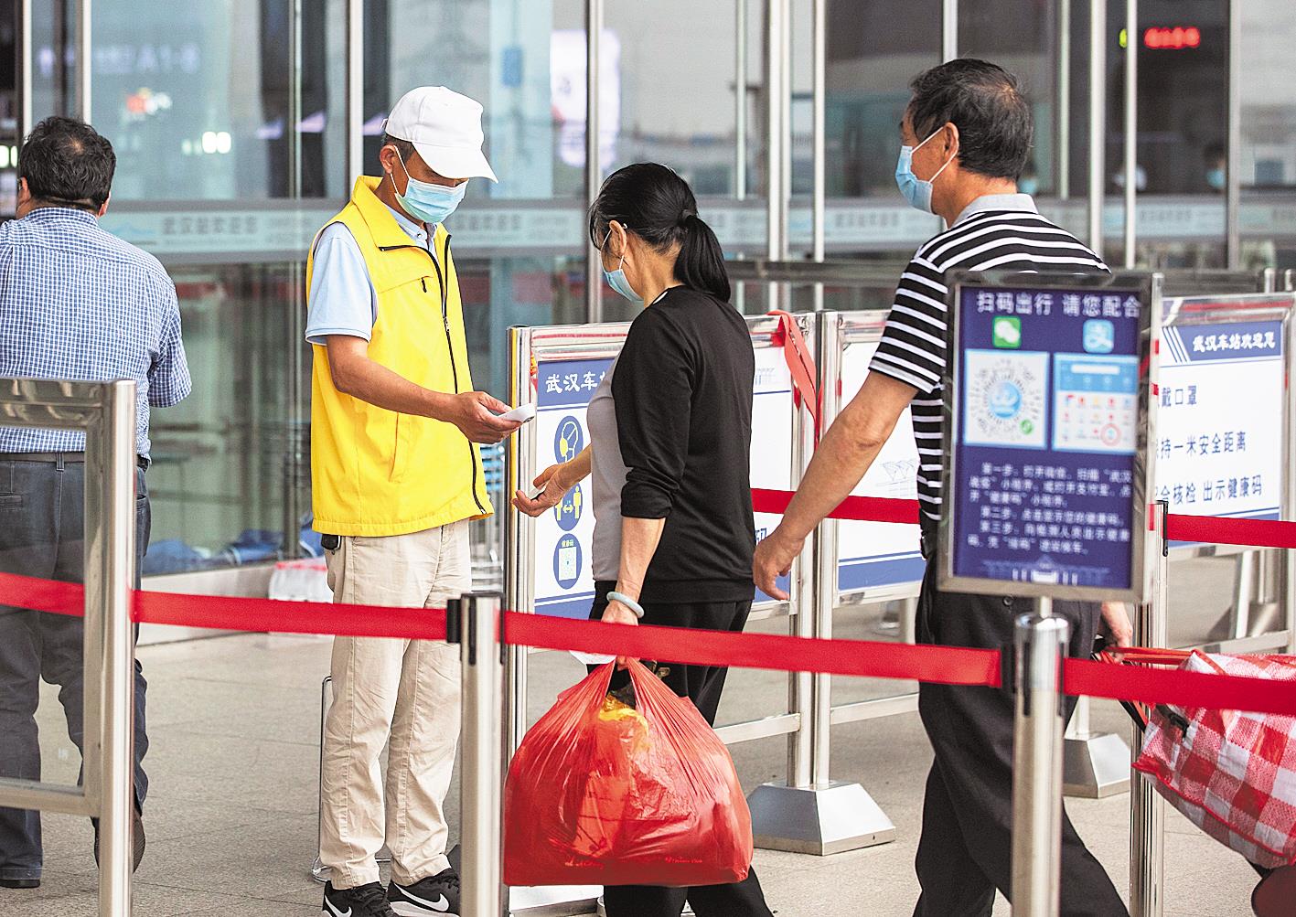 5月28日,志愿者在武汉站进站口测量旅客体温并检查健康码。目前,武汉三大火车站严格执行健康码核验和体温检测,并提醒旅客戴口罩,保持间距排队,同时加强对站内重点区域的消毒频次,全力保障旅客安全。
