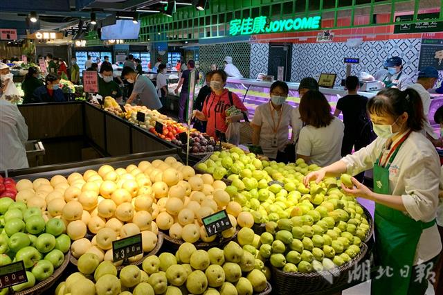 2020年5月30日,改造一新的中百市集水果湖店开门营业,复古新潮的装修风格与普通生鲜超市有明显区别。该店以社区邻里中心为主要服务轴心,一楼主打全球直销中心,二楼为中百仓储生鲜超市,囊括水果、蔬菜、鲜肉、水产、进口商品等,总面积3500平方米。同时,为了让市民买的放心,该超市设立了食品预检测系统,实现农药残留、亚硝酸盐等数百种检测,并着力打造智能化菜场,实现商品产地及生产流程溯源,满足市民“舌尖上”的安全。(湖北日报全媒记者 李溪 摄)