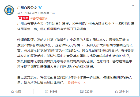 5月31日凌晨1:44,@广州白云公安 通报:关于网传广州市方圆实验小学一名教师涉嫌体罚学生一事,警方积极配合有关部门开展调查。