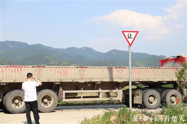狭窄省道上的大货车和让行提示牌