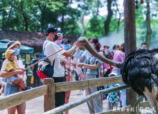 在东湖飞鸟世界,家长带着孩子喂食鸵鸟