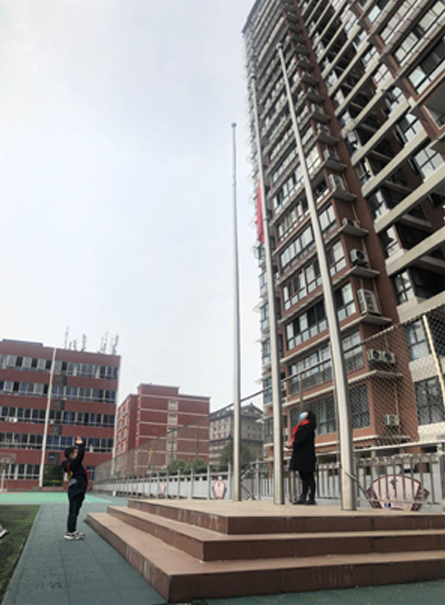 来到空旷的校园进行降半旗仪式