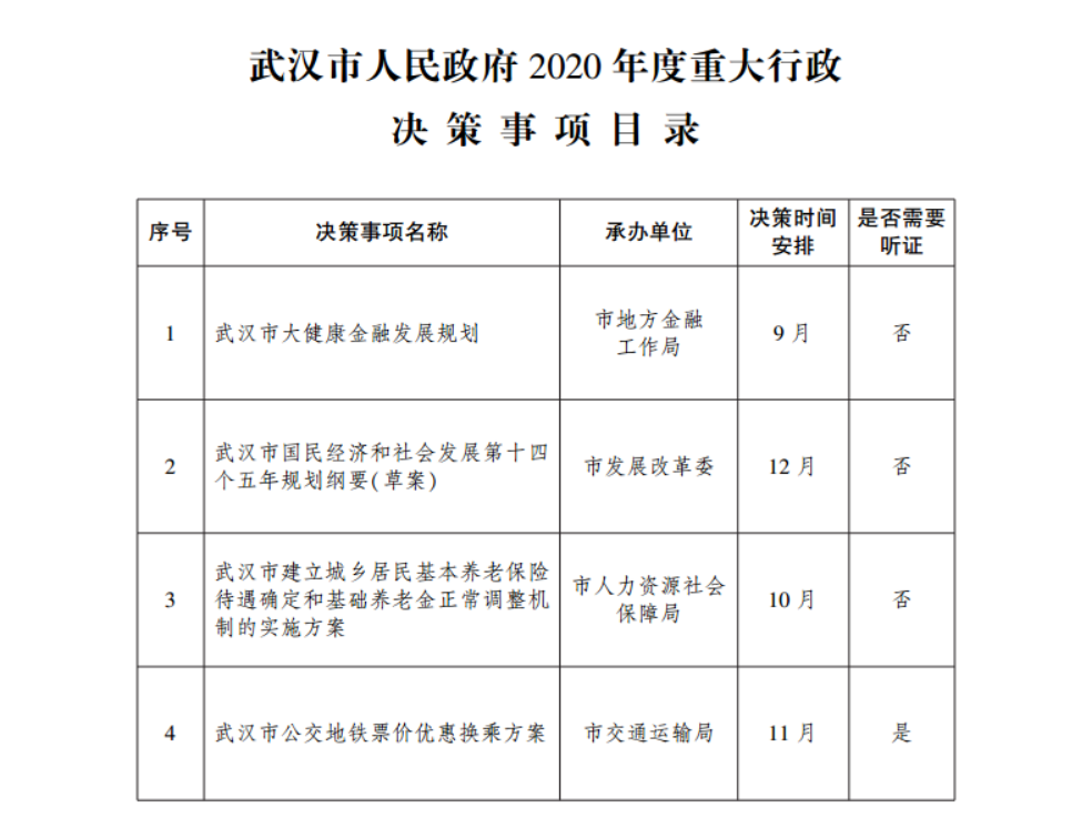 什么是重大行政决策?重大行政决策,是指武汉市人民政府在依法履行宏观调控、市场监管、公共服务、社会管理等职责过程中,对关系本市行政区域内经济社会发展全局、社会涉及面广、与人民群众切身利益密切相关的重大事项所作出的决定。哪些事项纳入重大行政决策?