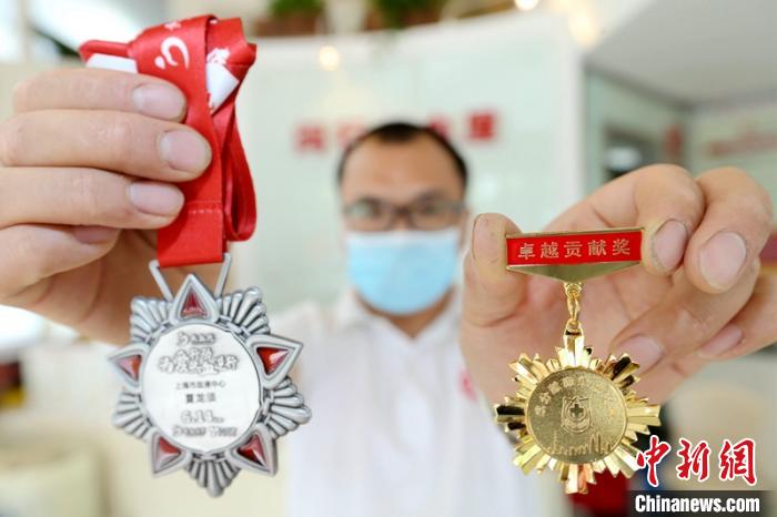 夏龙须展示他的献血荣誉奖牌 王亚东 摄