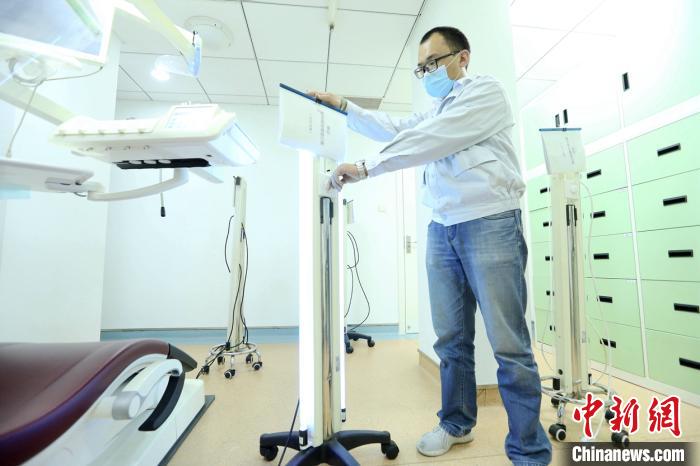 夏龙须检查他发明的移动紫外线消毒灯。 王亚东 摄