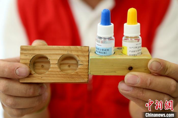 夏龙须为爱心献血屋制作的“试剂瓶防倒托”。 王亚东 摄